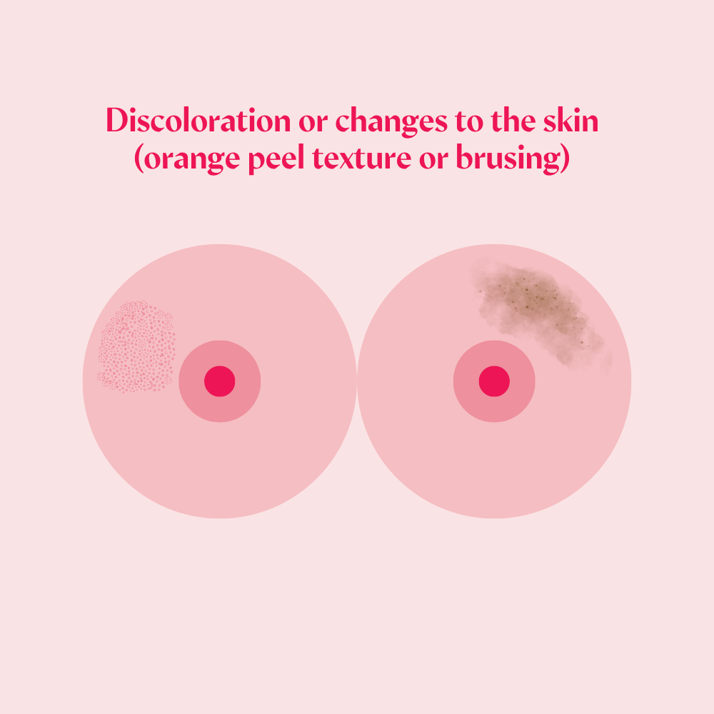 While standing in front of a mirror, check your breasts for any visible changes. Be sure to check with your arms in these three positions: resting at your side, resting on the hips, & raised above your head.